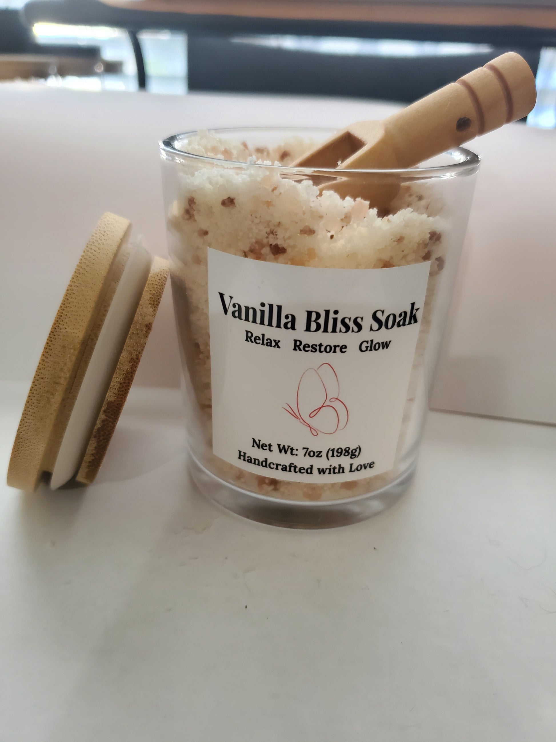 Transform your bath into a spa-like escape with our Vanilla Bliss Soak — a luxurious blend of Himalayan pink salt, Epsom salt, and nourishing coconut oil infused with the warm, comforting scent of vanilla. Each handcrafted jar is designed to melt away stress, soothe sore muscles, and leave your skin soft, refreshed, and glowing.