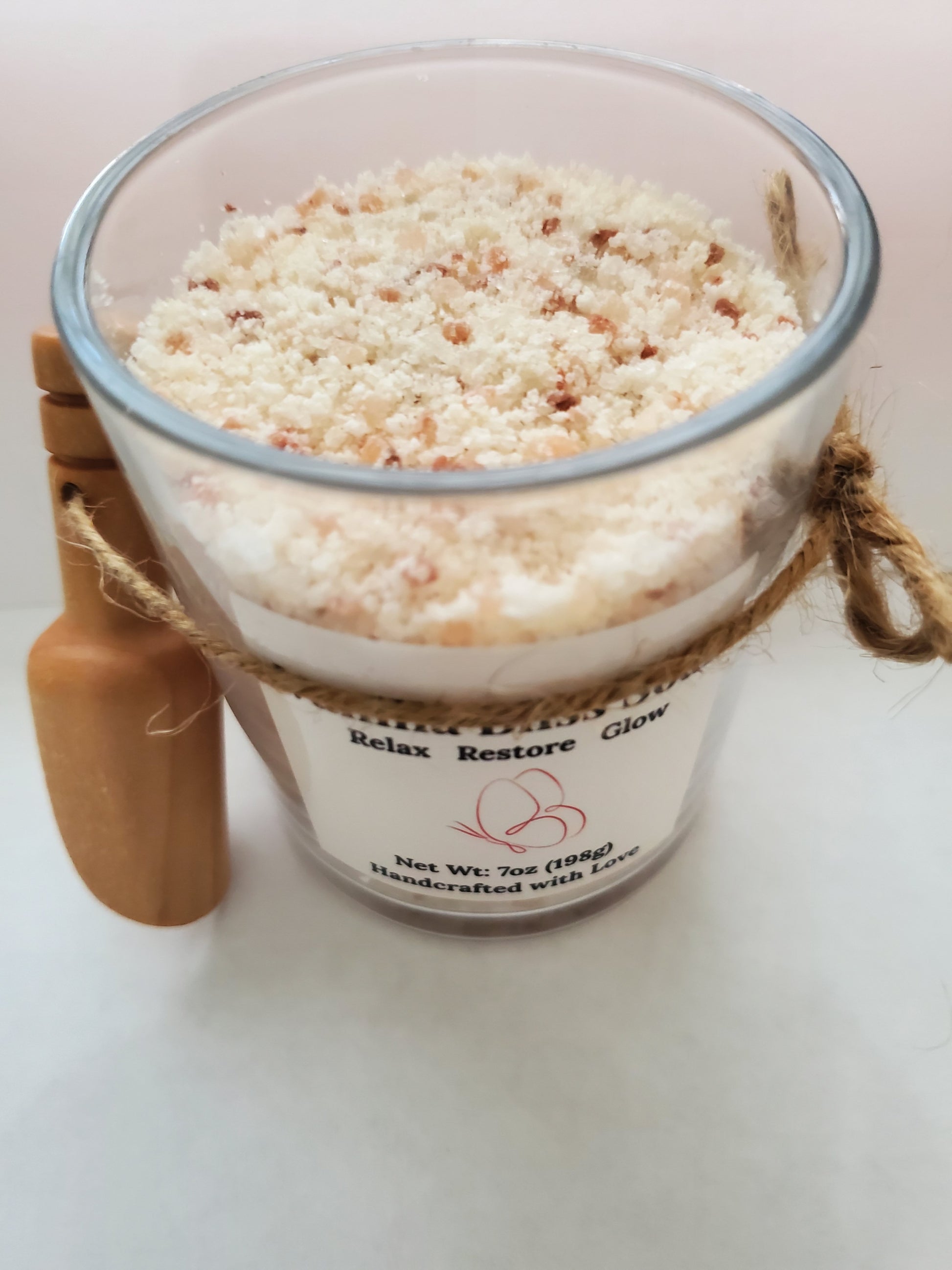 Epsom Salt, Pink Himalayan Salt, Baking Soda, Coconut Oil, Vanilla Fragrance, Mica (for subtle shimmer).